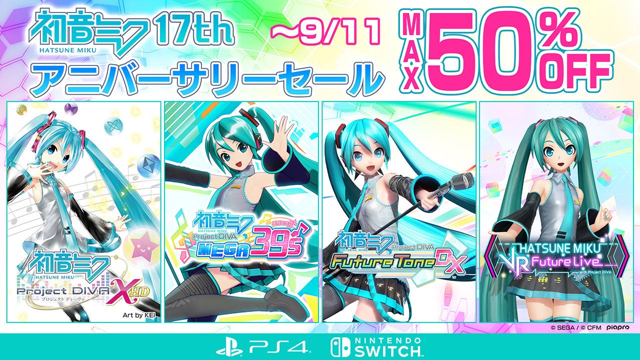 株式会社セガは、PlayStation™Storeおよびニンテンドーeショップにて販売中の一部PlayStation®5/PlayStation®4/Nintendo Switch™用タイトルを対象とし、期間限定で特別価格にて販売する「初音ミク 17thアニバーサリーセール」を開催中です。