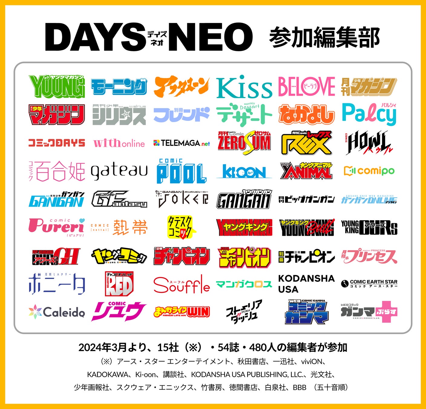 これによりDAYS NEOは「15社・54誌・480人の編集者と出逢えるマンガ投稿サイト」に進化します。