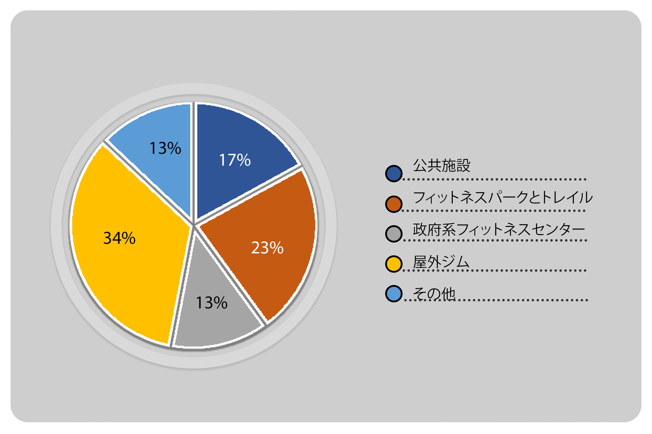 用途に応じて、公的機関、フィットネスパーク&トレイル、政府のフィットネスセンター、屋外ジムなどに分かれています。