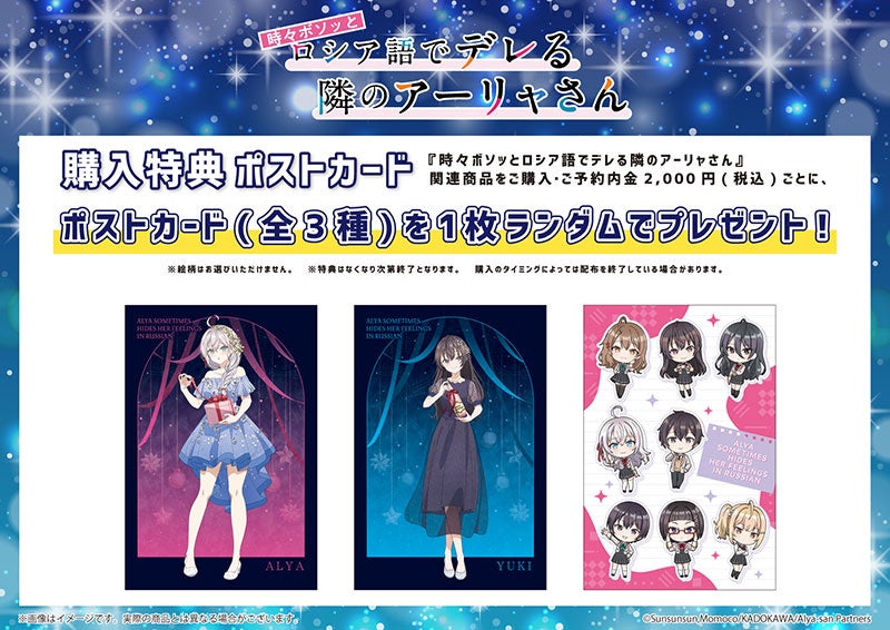 会場内にて『時々ボソッとロシア語でデレる隣のアーリャさん』関連商品をご購入・ご予約内金2,000円(税込)ごとに特典ポストカード(全3種)をランダムで1枚プレゼント!