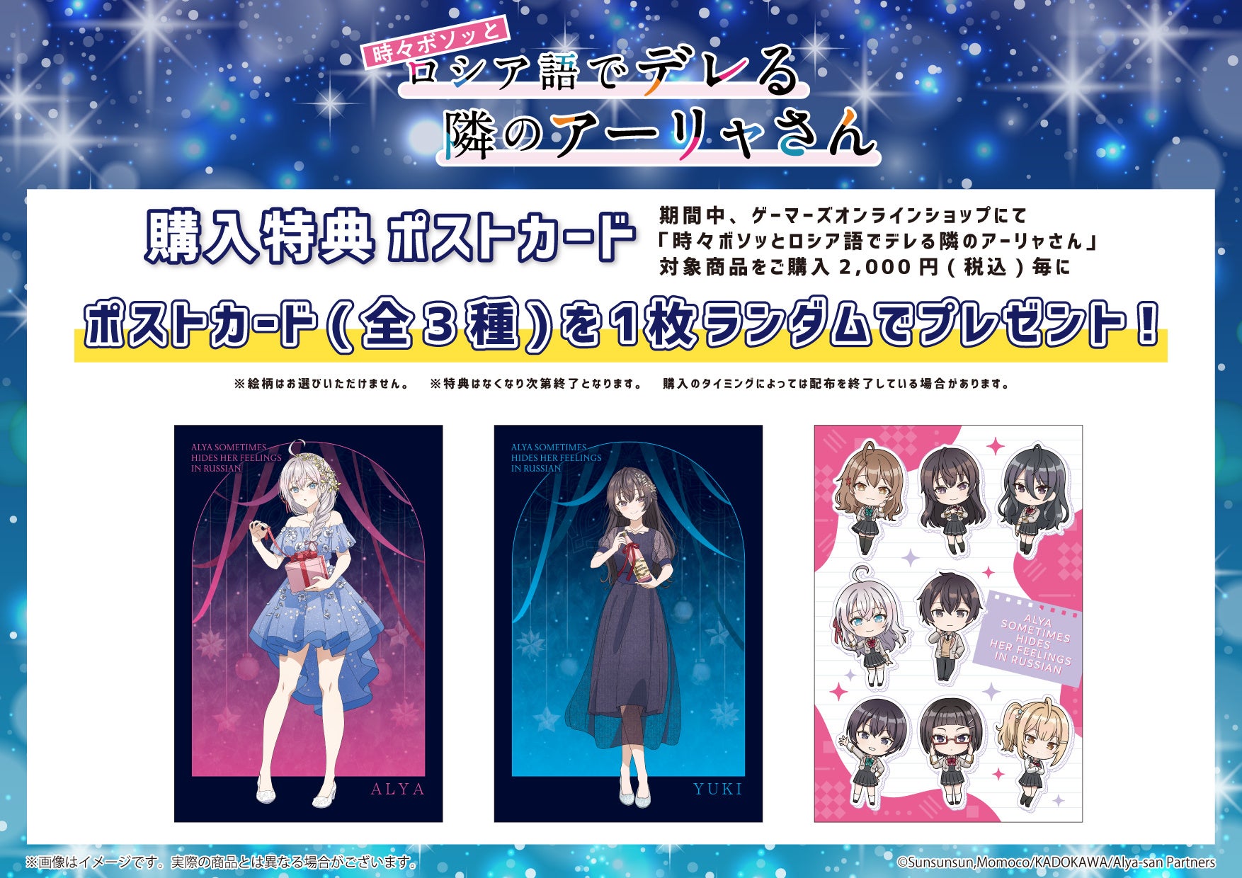 期間中、ゲーマーズオンラインショップにて『時々ボソッとロシア語でデレる隣のアーリャさん』【対象商品】を2,000円(税込)お買い上げごとに、特典ポストカード(全3種)をランダムで1枚プレゼント!