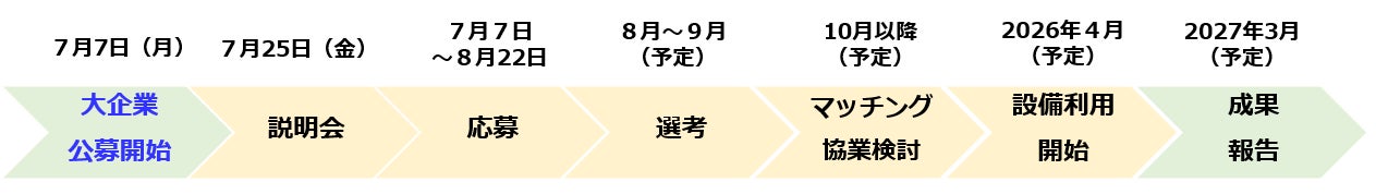 本事業の参加大企業の決定後、参加企業の施設利用を通じた事業開発や協業を希望するスタートアップ・中小企業の募集を予定しています。
