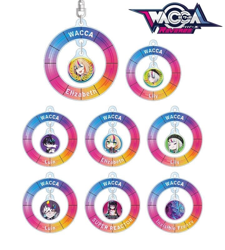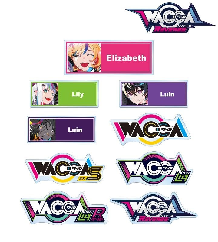 エリザベス、リリィ、ルーンのイラスト、WACCA、WACCA S、WACCA Lily、WACCA Lily R、WACCA Reverseのロゴをアクリルネームプレートに仕上げました。