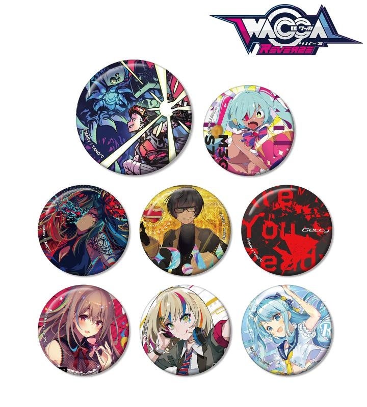Liberate、MAGiC4LG1RL M3GA S7R1KE!、Metamorphose、ADAM、Are You Ready、LEVATEiN feat. 野宮あゆみ、Let you DIVE!、Rainbow Dreamの楽曲ジャケットイラストを缶バッジに仕上げました。