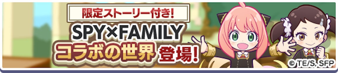 内容:「SPY×FAMILY コラボの世界」は、TVアニメ『SPY×FAMILY』のキャラクターたちが活躍する「限定ストーリー」が読める期間限定のコラボ専用ワールドです。