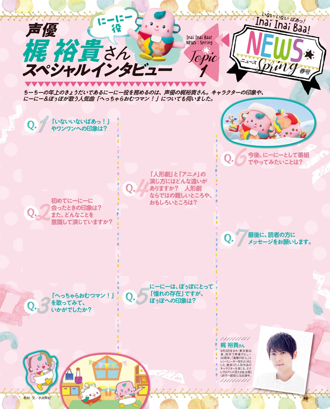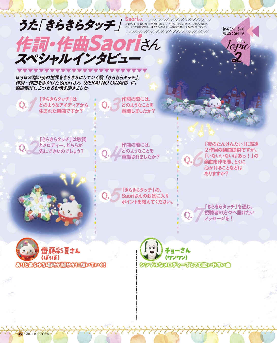 小さなお子さんが楽しめるのはもちろん、保護者の方も「いないいないばあっ!」の世界を味わえます。春号ではにーにー役の梶裕貴さん&新曲「きらきらタッチ」を作詞作曲したSaoriさんにインタビュー。もちろんワンワン、おうちゃん、ぽぅぽ役齋藤彩花さん、ワンワンわんだーらんどメンバーなど、活躍するメインキャストたちのコメントも掲載しています。