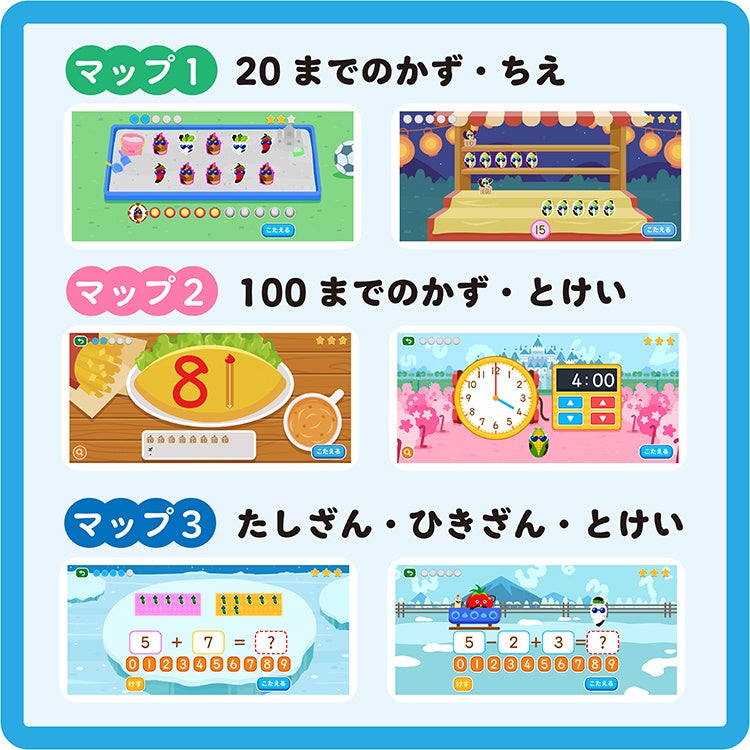 現在『さんすうランド』は3つのマップごとに学習が可能です。お子さんの発達に合わせた出題で、学習能力がぐんぐん伸びます。