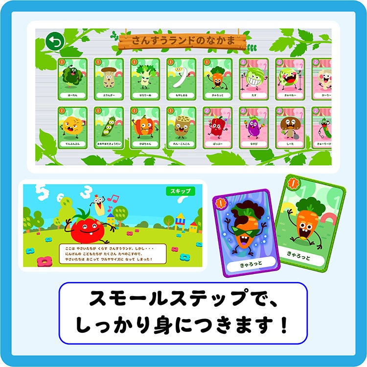 ユーモアあふれるキャラクターと演出でさんすうを楽しみながらクリアを目指し、キャラクターカードをゲットしましょう!