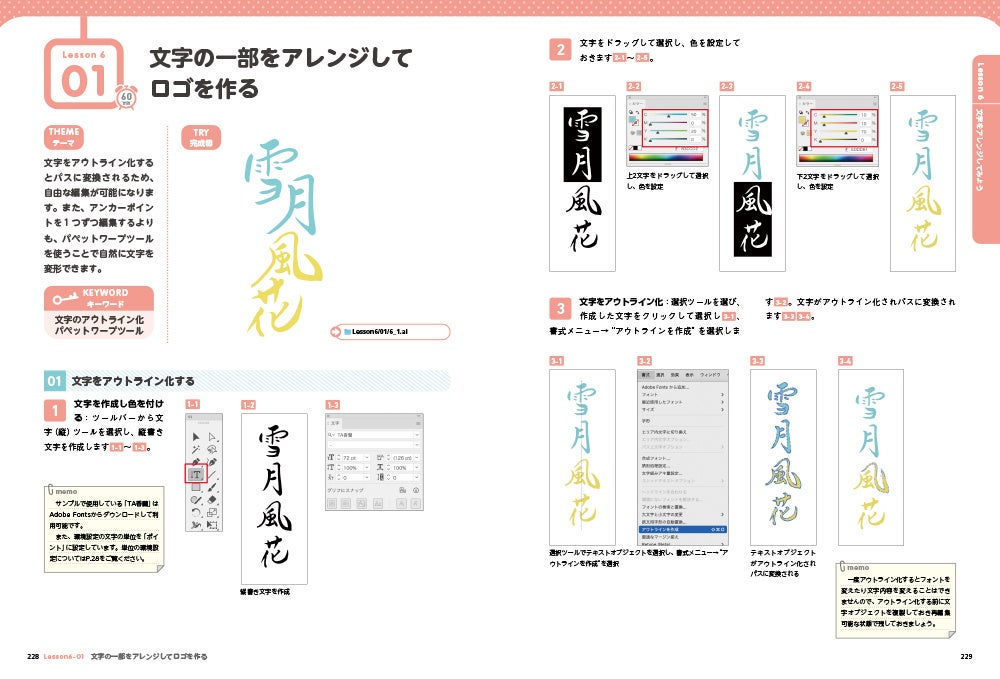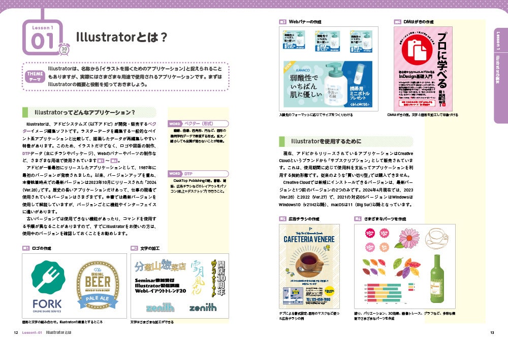 また、文字をふちどりしたり、図形を変形して動きをつけたり、パターンを作ったりと、多彩なデザインのアレンジ方法も身につきます。さらに、Web・印刷の納品データの書き出し方や注意点もフォロー。Illustrator 2024の最新機能である3Dや生成AI機能についても紹介しています。