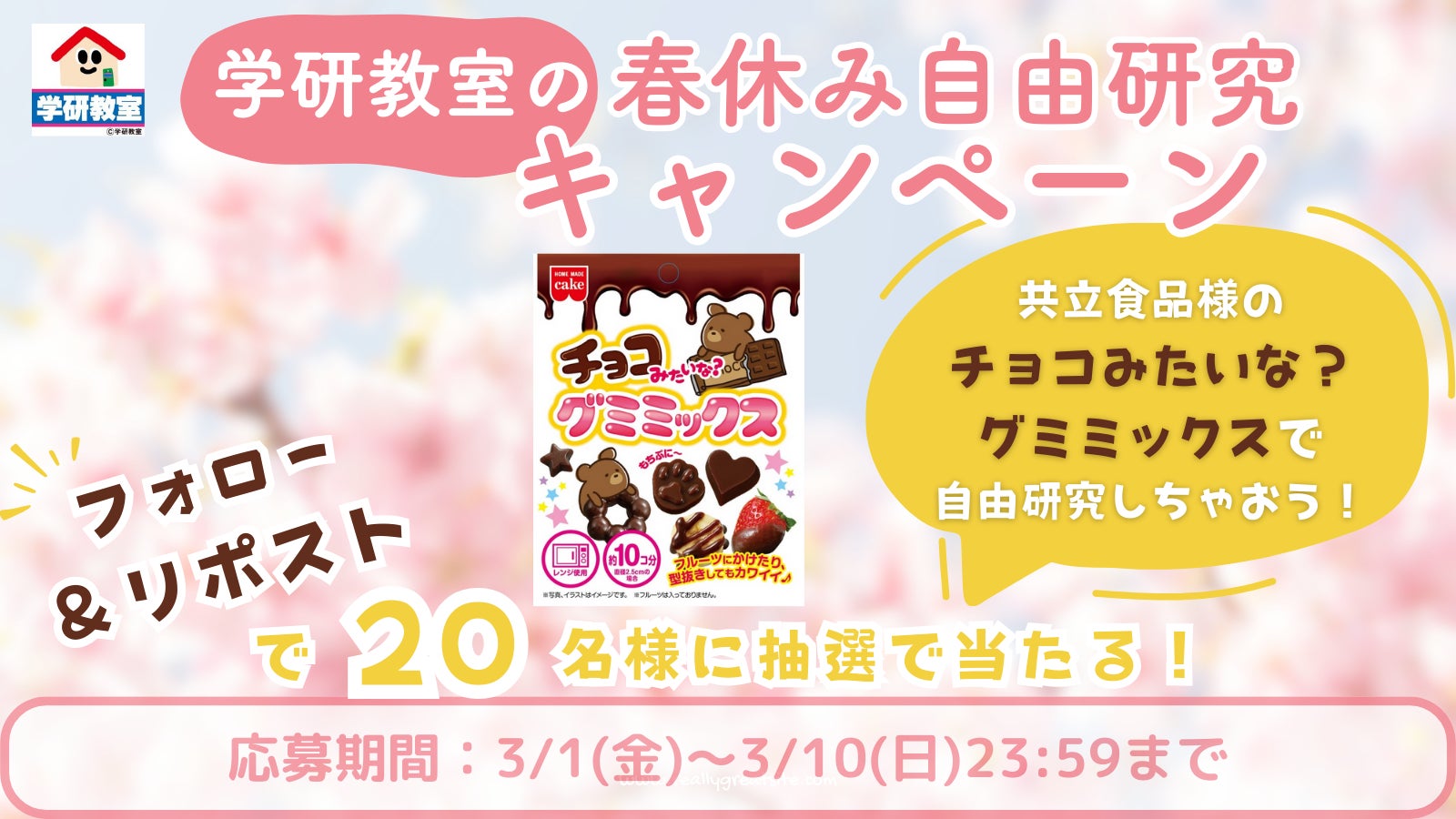 学研教室公式X(旧Twitter)をフォロー&リポストして共立食品様の「チョコみたいな?グミミックス」を当てて、楽しく春休みにも自由研究しちゃいましょう!