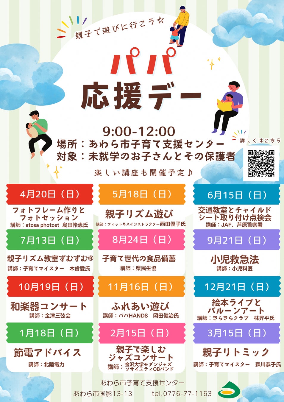 当日はあわら市子育て支援センターの「パパ応援デー」では、チャイルドシートの重要性などを学ぶ、交通教室も同時に開催されます。