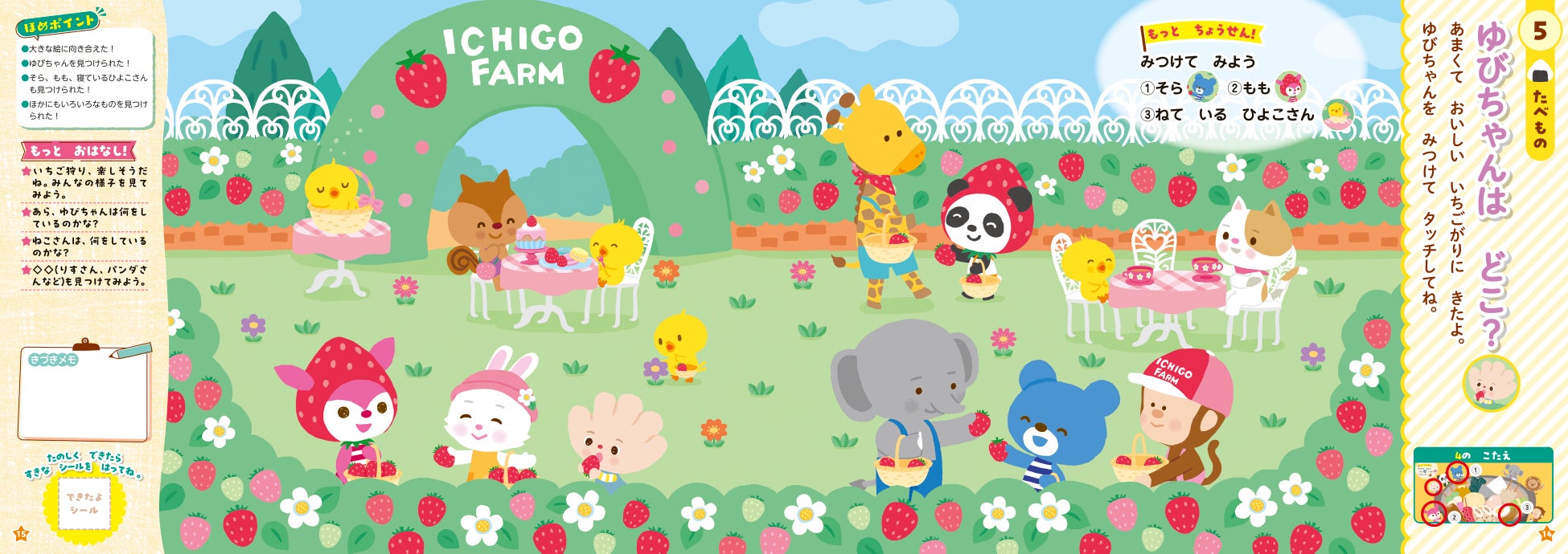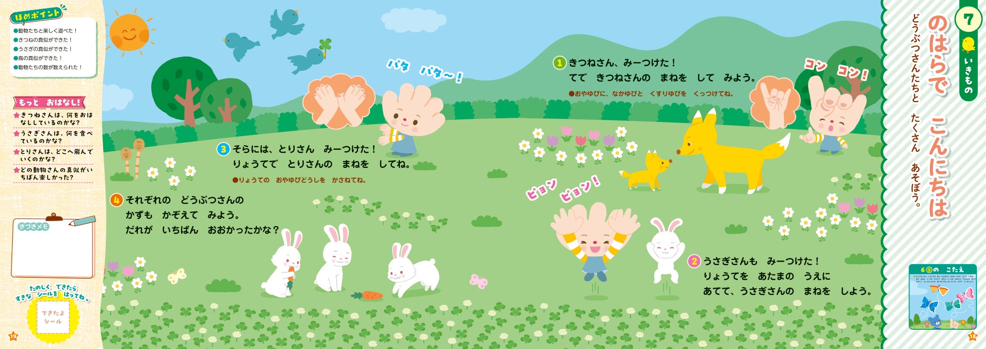 子どもが大好きな「シール」「ゆびなぞり」「てあそび」「みつけてタッチ」のほか、その年齢の発達に合わせた難易度のさまざまな単元を、好きなページからはじめられ、短時間で終えられるように、わかりやすい構成でまとめています。