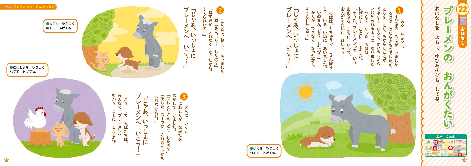 実際に保育園の2歳・3歳クラスを取材見学。好きなものや反応などを確認し、リアルな読者が楽しめることを追求しています。また、10年以上におよぶ保護者の方へのアンケートでの希望を丁寧に拾って反映。「昔話にふれさせたい」「基本的な生活習慣を身につけさせたい」「怒らずに続けられるぐらいの軽さ」といったリクエストに合わせた構成を実現しています。