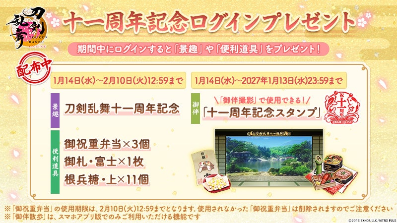 期間中、ゲームにログインした全ての方を対象に、景趣「刀剣乱舞十一周年記念」や便利道具などをプレゼントいたします。