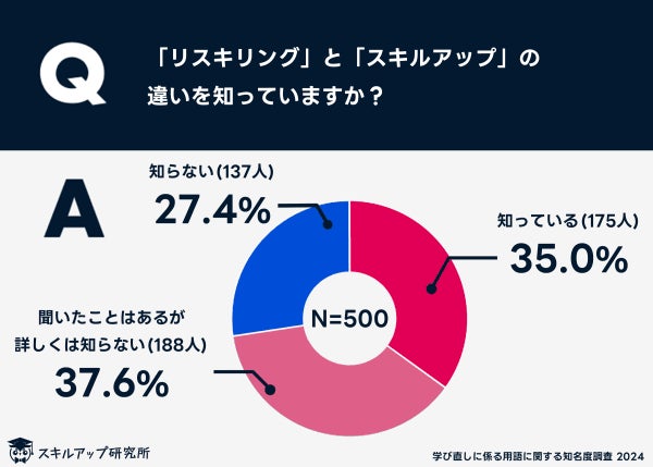 「『リスキリング』と『スキルアップ』の違いを知っていますか?」という質問に対し、35.0%が「知っている」と回答。一方で、詳しくは知らない、全く知らないと回答した人は計65.0%であった。