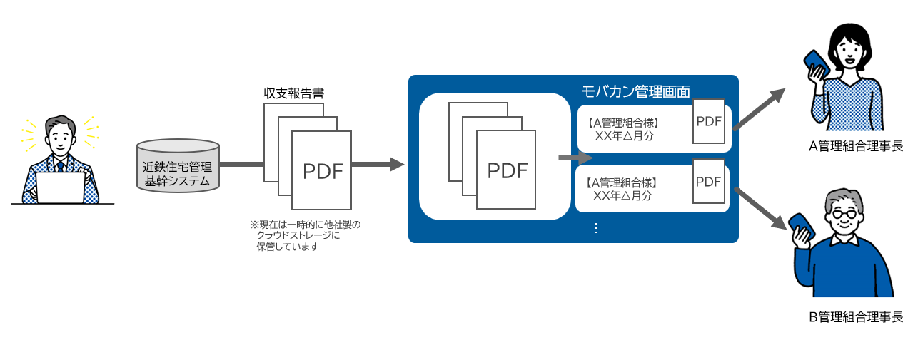 パナソニックが近鉄住宅管理に提供するのは、同社からの要望により開発した「収支報告書配信プラン(*2)」です。本プランは管理会社の基幹システムと「モバカン」を連携させることで、収支報告書を電磁的方法により管理者(理事長)様宛てに送付することができます。