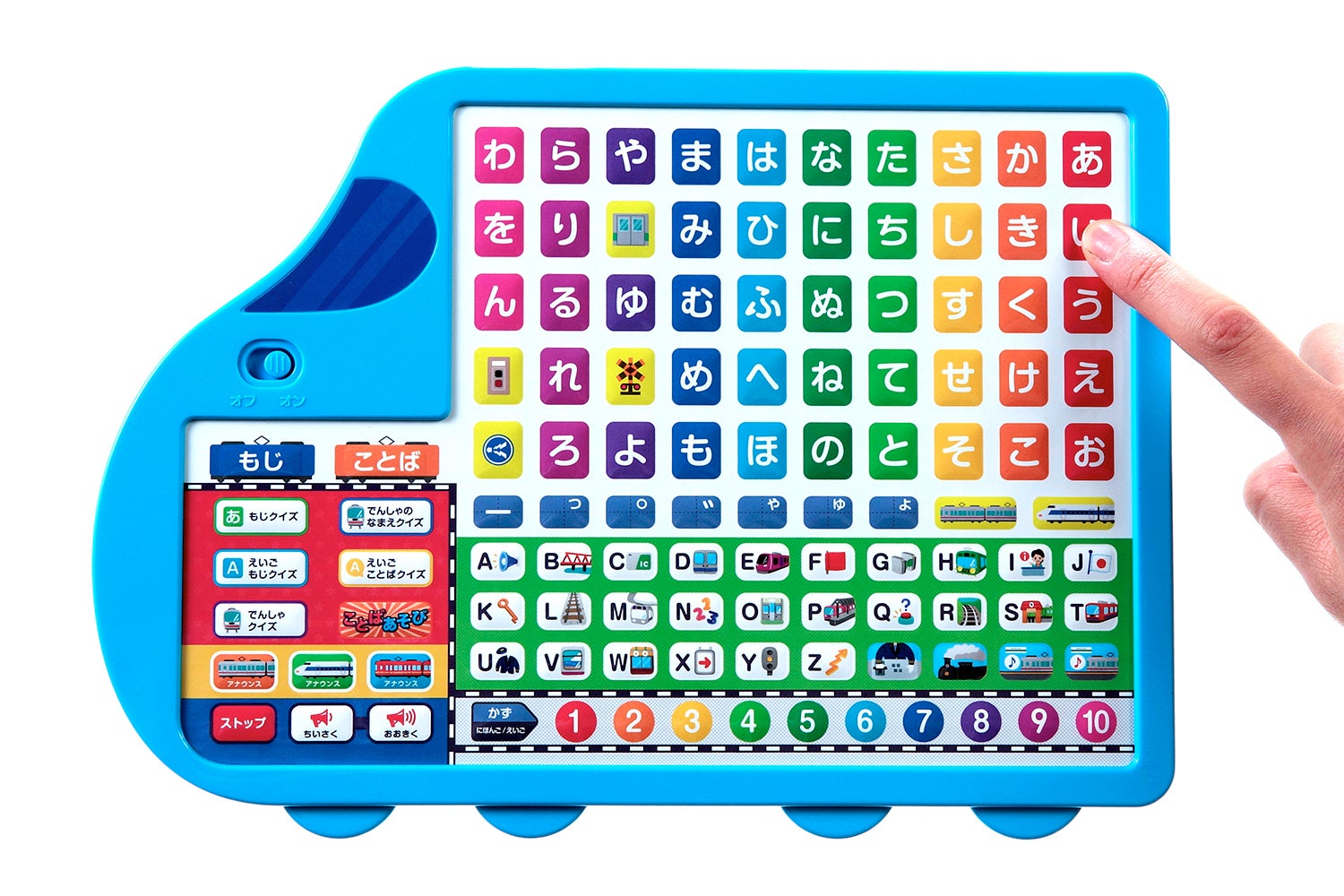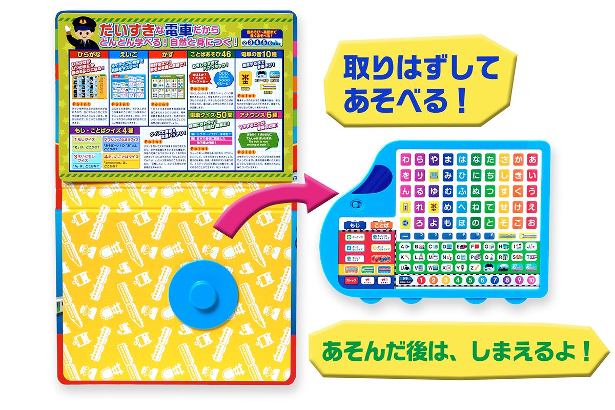 2020年に発刊し、その後累計発行部数5万部の人気商品となった『あいうえお・ABC でんしゃタブレット』は、ボタンを押して、ひらがなや数字、英語を音で学べたり、電車にまつわる音やアナウンスが楽しめる大人気商品です。
