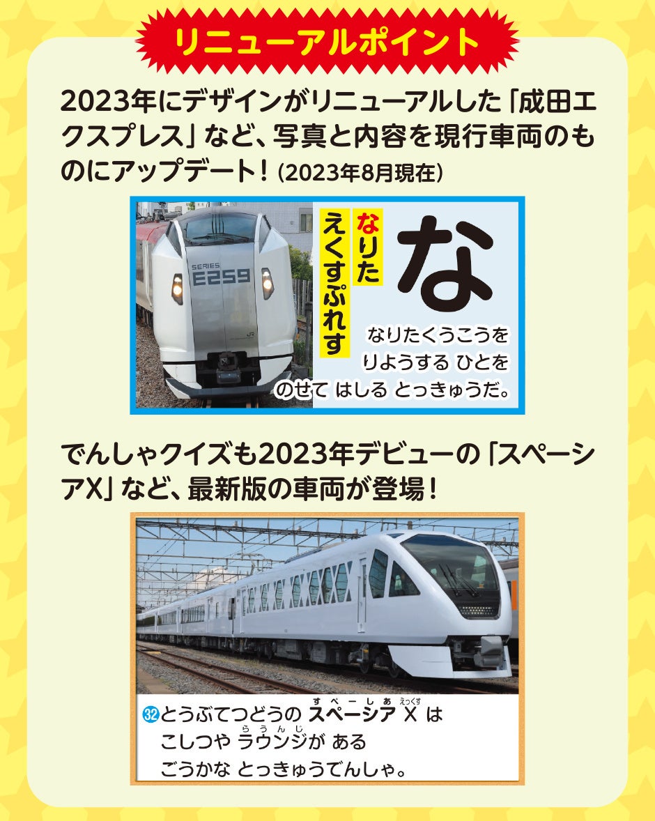 例えば、「あいうえお でんしゃずかん」では、2023年にデザインがリニューアルした「成田エクスプレス」が登場! さらに、「でんしゃクイズ」や「ことばあそび」も最新版の車両のクイズが収録され、電車キッズが大満足の内容になっています。(2023年8月現在)