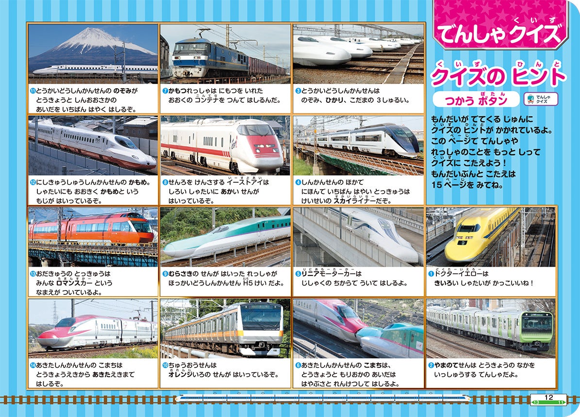 付属の冊子には、ひらがな表がついた「あいうえお でんしゃずかん」や、英語にまつわる単語を紹介した「アルファベット表」、「でんしゃクイズ」など、電車にちなんだ内容がたっぷりで、お勉強と一緒に、電車の知識がさらに広がります。