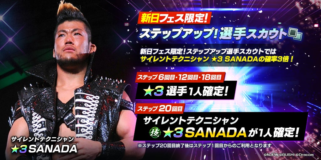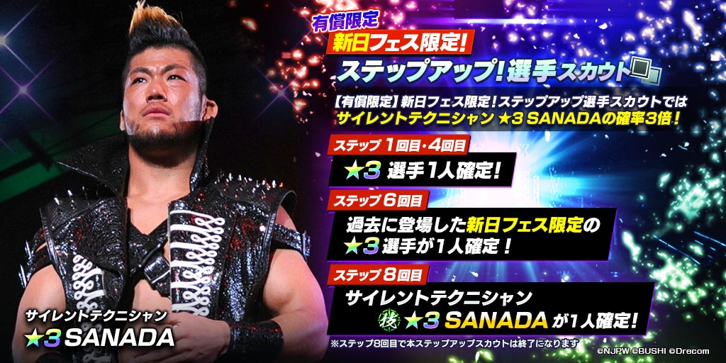 ブシモ『新日本プロレスSTRONG SPIRITS』フェス限定となる新★3SANADA選手と新SSRパートナー後藤選手が初登場する各フェス限定ステップアップスカウトを開始!