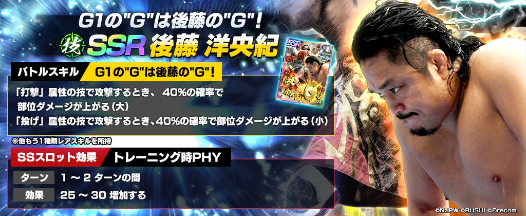 さらに、初登場となるフェス限定新SSRパートナー「[G1の”G”は後藤の”G”!]後藤洋央紀」は、ピックアップ対象パートナーとして、ステップアップ回数に関わらずスカウト確率が通常の3倍となっております。