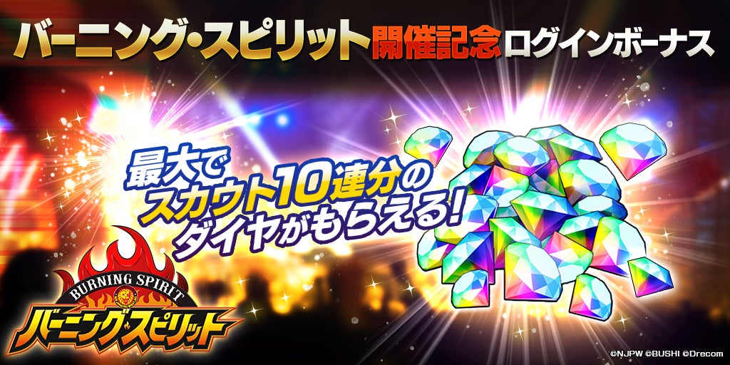 - 新日本プロレスのバーニングスピリット開催を記念して、最大1,500ダイヤ(10連スカウト1回分)が獲得できるログインボーナスを実施!