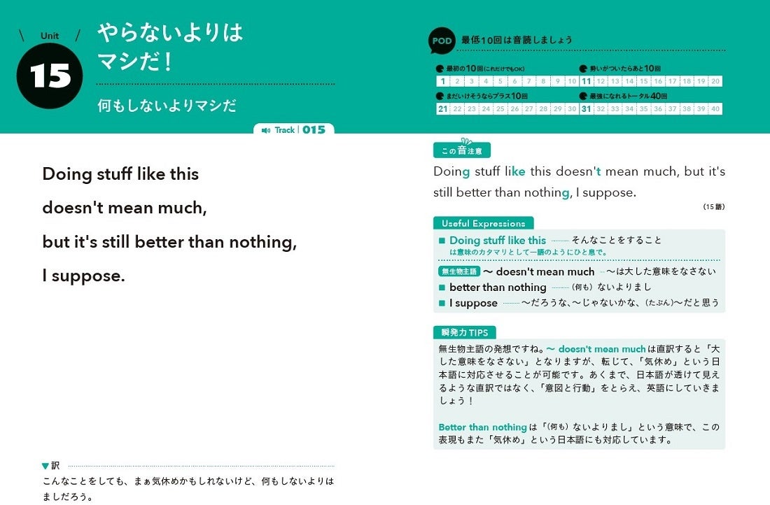 英語を話す回路を力ずくで手に入れる、1日15分の音読トレーニング、ビジネスシーン編。職場の雑談でもすぐに使える、こなれた英語をインプット。英語での会話を楽しむことができるレベルまで学習を継続できます。