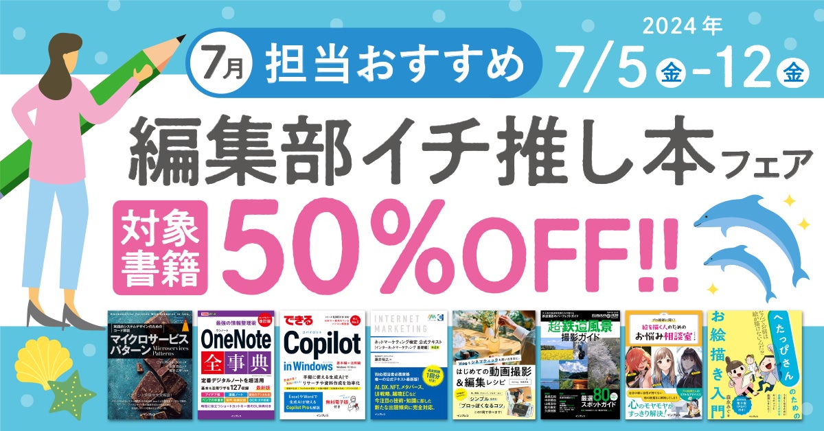 「この本をぜひ読んでほしい!」そんな編集者の熱い気持ちをお届けする、お得な電子書籍セール「担当おすすめ!編集部イチ推し本フェア」。インプレスブックスで販売している電子書籍を対象として50%オフで販売いたします。IT、デザイン、ビジネス、写真撮影など、幅広いジャンルから毎月、編集者の「今だからこそおすすめしたい良書」をご紹介していきます。おすすめポイントをまとめた編集者のコメントも掲載しておりますので、ぜひ購入の参考にしてください。