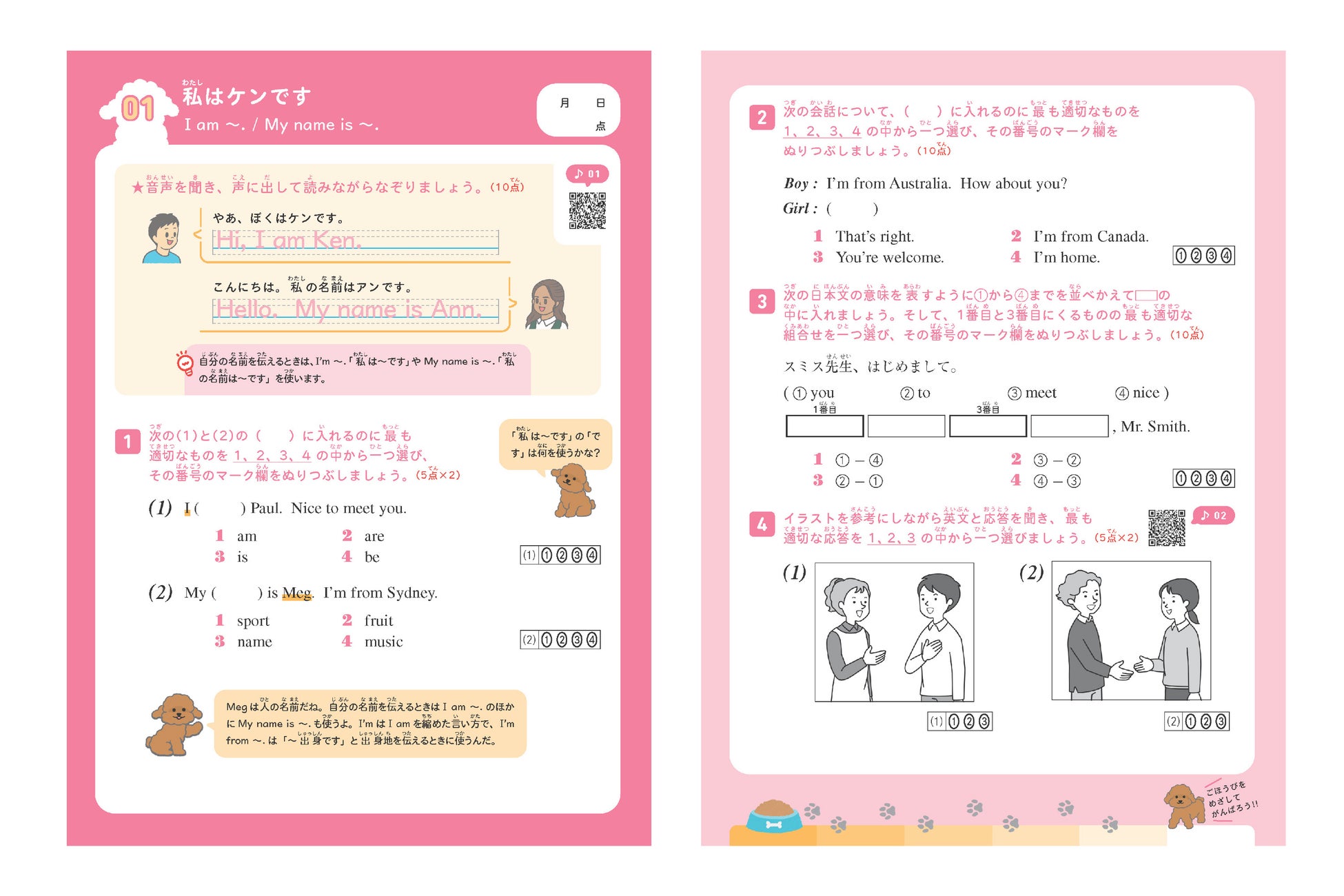 まず、英検でよく出題される表現やテーマを学びます。二次元コードを読み取って音声を聞き、声に出して読みながらなぞってみましょう。その後に、学んだことを確認できる練習問題に取り組みます。かわいい犬のキャラクターのサポートを受けながら、問題を解くことにチャレンジしてみましょう。