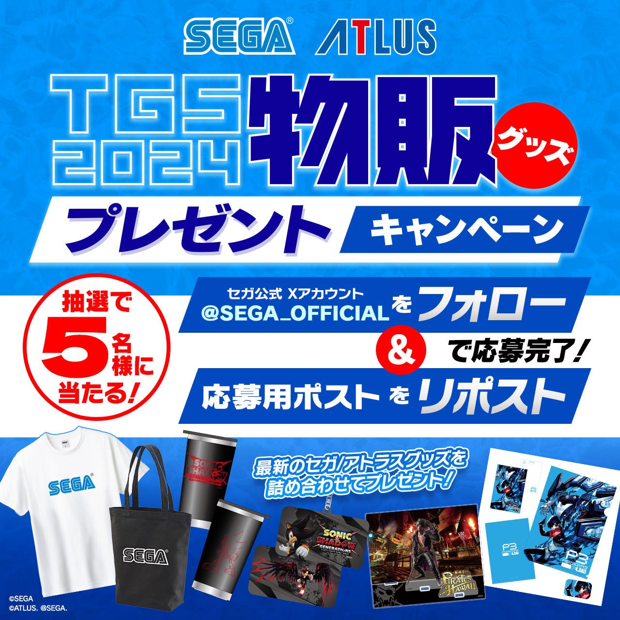 TGS2024の物販コーナーにセガ/アトラスが出展! これを記念して、セガロゴグッズ、セガ/アトラス人気タイトルグッズの詰め合わせセットが抽選で5名様に当たるプレゼントキャンペーンを開催いたします。