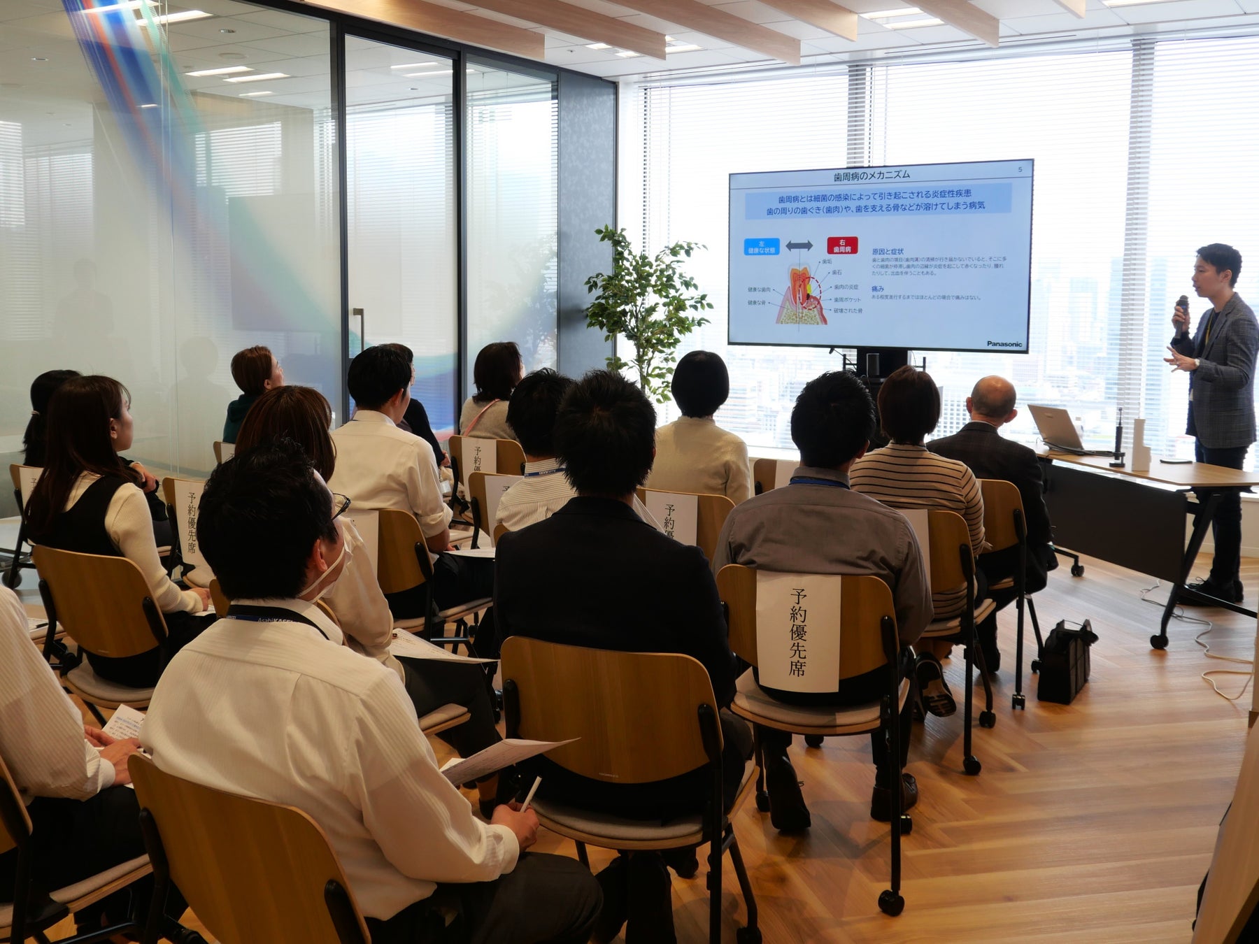本イベントでは、旭化成の社員を対象に、オーラルケアセミナーとパナソニックの美容家電・健康家電の展示・体験会として実施し、オーラルケアセミナーでは、主に歯周ケアについての理解を深め、歯周病のリスクや、歯周病に起因する体への悪影響などを説明しました。パナソニックの美容・健康関連製品の展示・体験会では、ヘアードライヤー、メンズシェーバー、オーラルケア製品、フェイスケア製品等の製品を展示し、製品の使い方やメリットについて担当者から説明を行いました。
