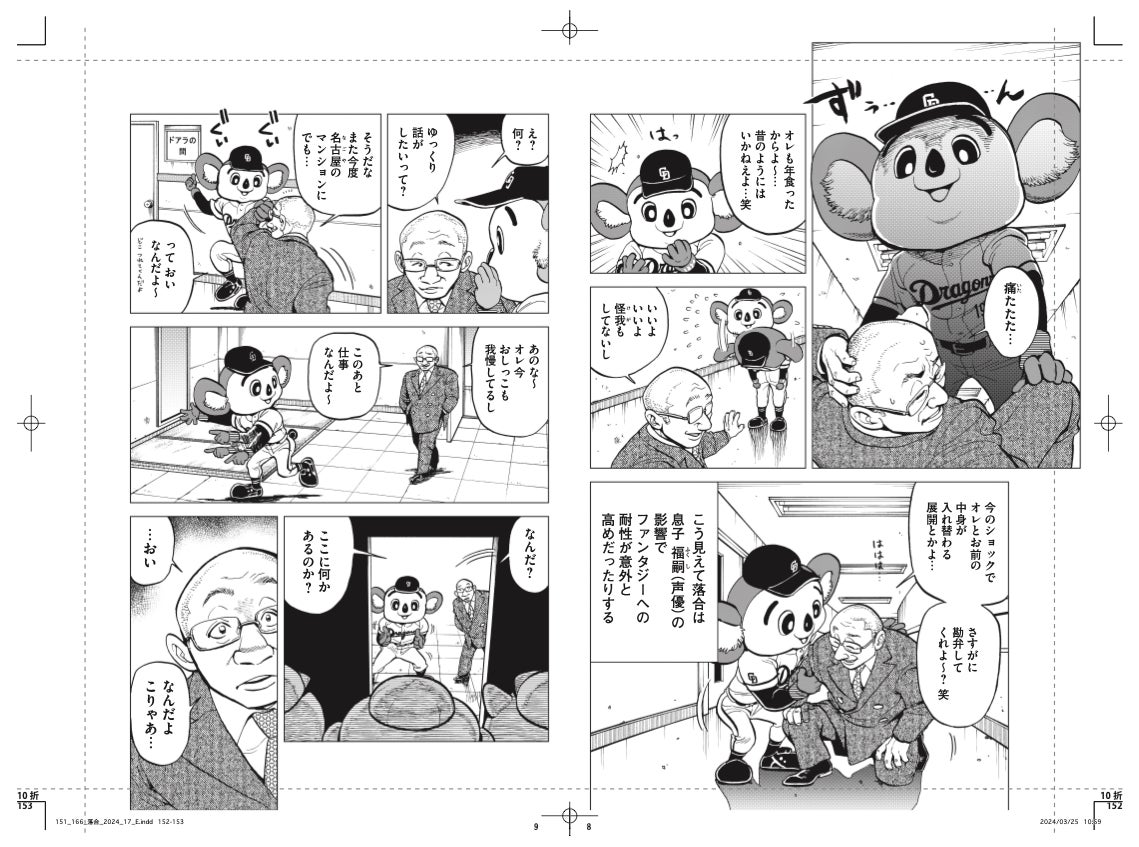 連載第1話の冒頭、中日ドラゴンズのファン感謝イベントにゲスト出演した落合博満氏が、イベント会場でドアラと久しぶりの再会。