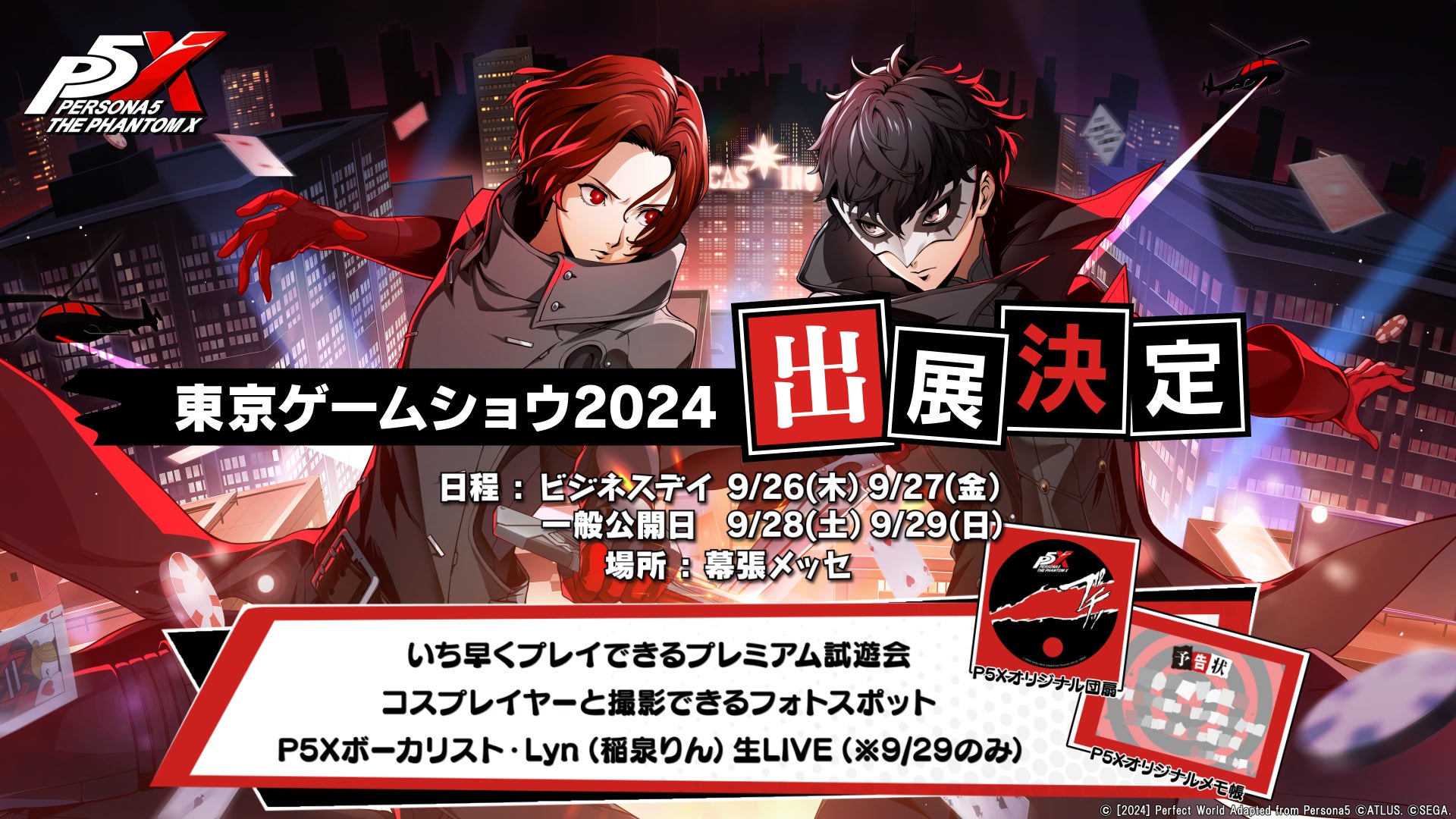 『P5X』にいち早く触れていただけるプレミアム試遊会ブースやフォトスポット、プレミアム試遊特典の「P5Xオリジナル団扇」や、事前登録特典のノベルティ「P5Xオリジナルメモ帳」の配布、公式コスプレイヤーが登場します!