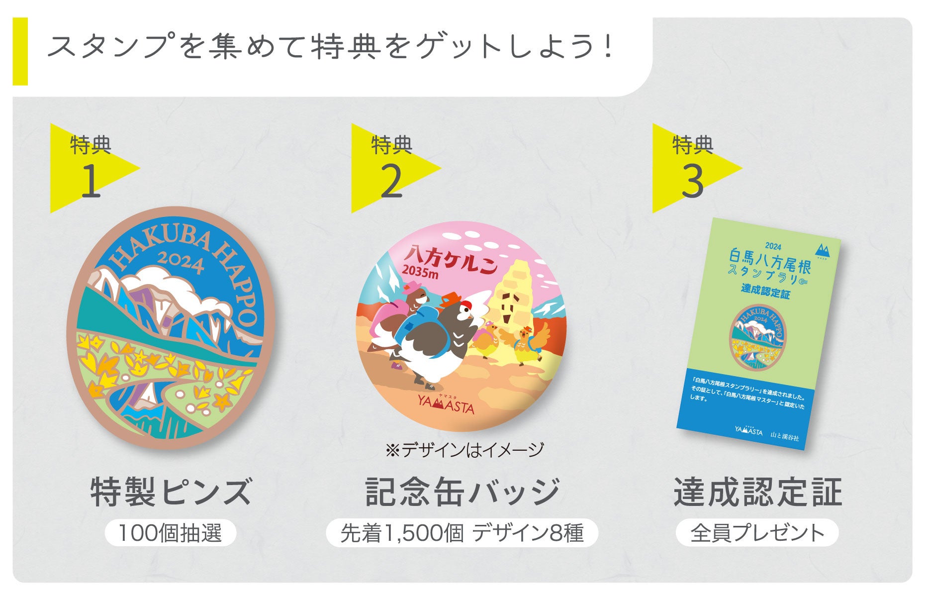 スタンプラリーを達成すると記念缶バッジと達成認定証がもらえるほか、山のお土産ブランド「Yamasanka(ヤマサンカ)」とコラボした特製ピンズの抽選に応募することができます。