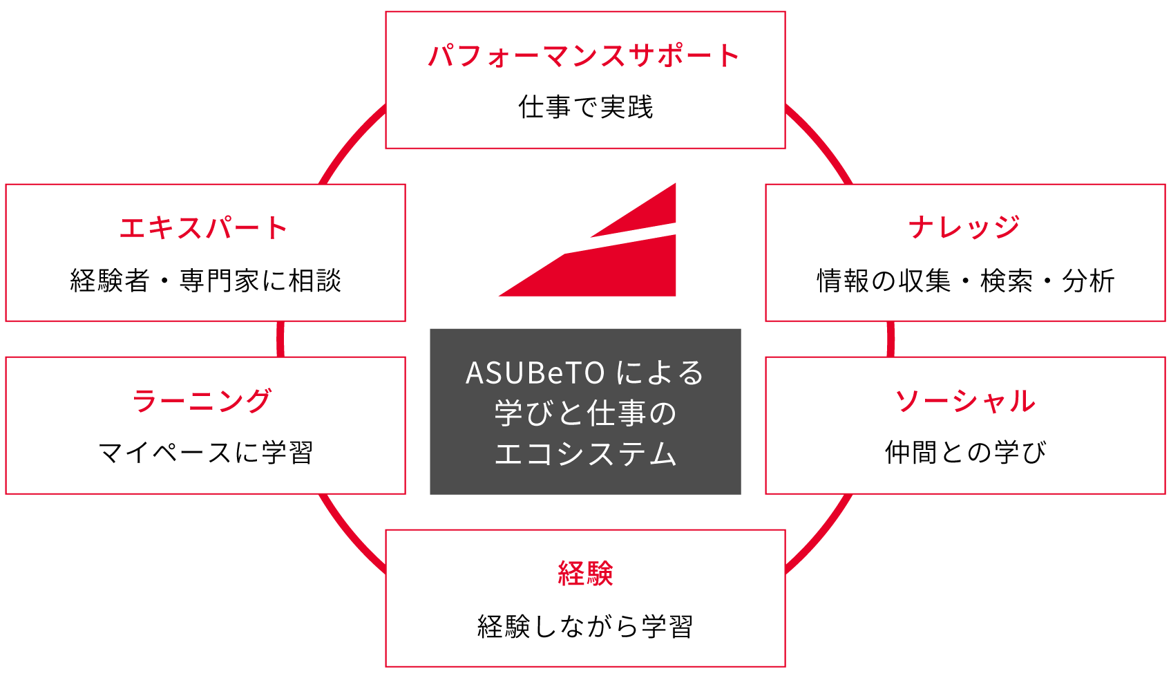 従来型のLMS(Learning Management System:学習管理システム)の枠を超えたPSS「ASUBeTO」は、組織の業務を効率的に進めるためワークとラーニングを分けず、現場で必要な情報や手順・ルールなどに素早くアクセスする、業務に関するいろいろな形式の情報をシェアする、個々人が互いに学び合うなど、さまざまな局面で活用が可能です。