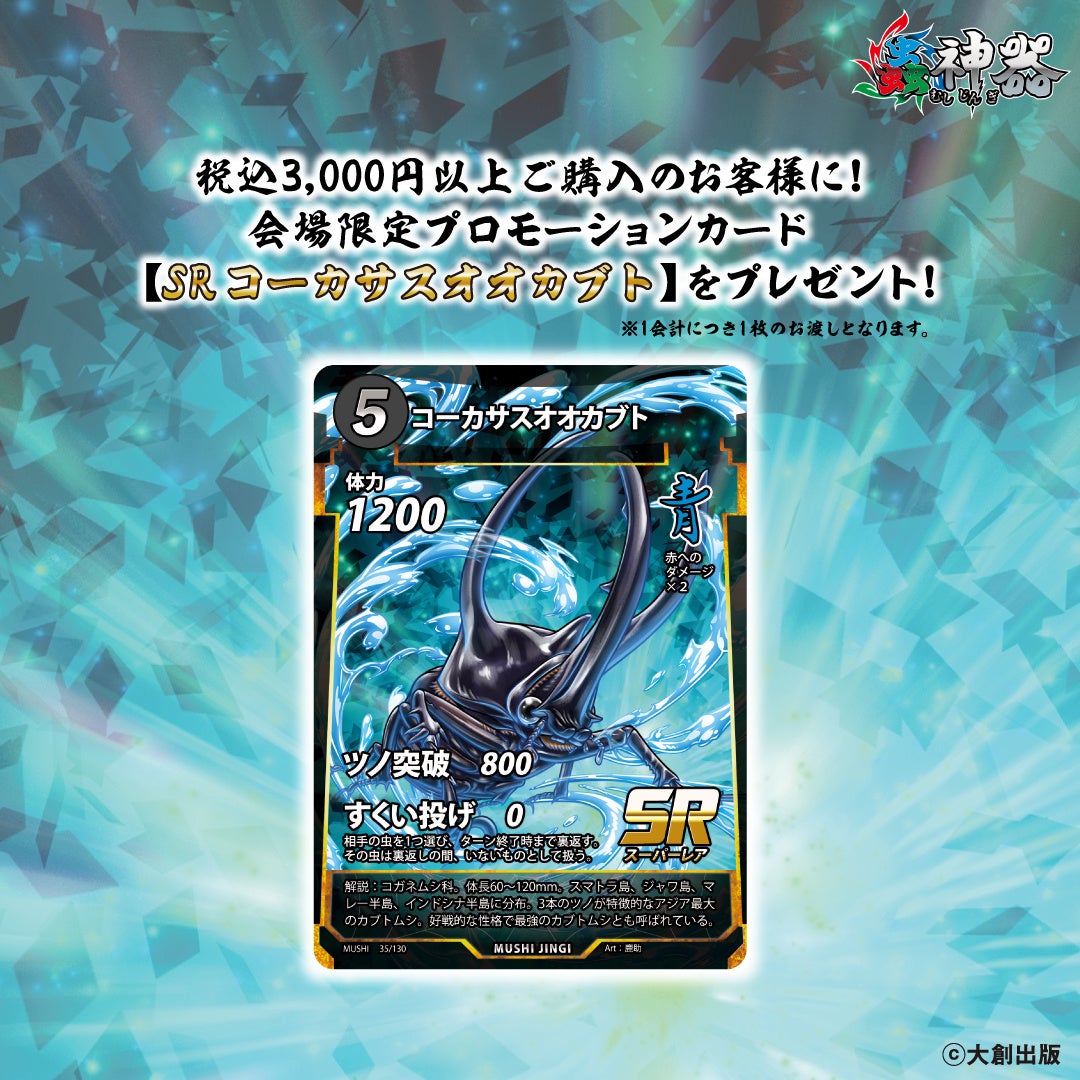 1回のお会計で、税込3,000円お買い上げで会場限定プロモーションカード『SR コーカサスオオカブト』を1枚プレゼント!