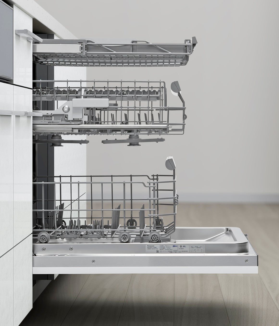 多種多様な食器や調理器具、マイボトルや弁当箱、小物類まで収納できる大容量のスライド式3段カゴでまとめ洗いが可能
