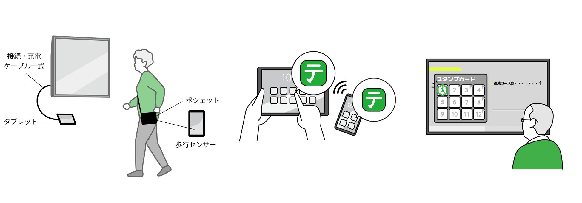 タブレットを操作してコースを選び、歩行センサーを入れたポシェットを身につけて足踏みすると、足踏み運動に合わせておさんぽ映像が進みます。