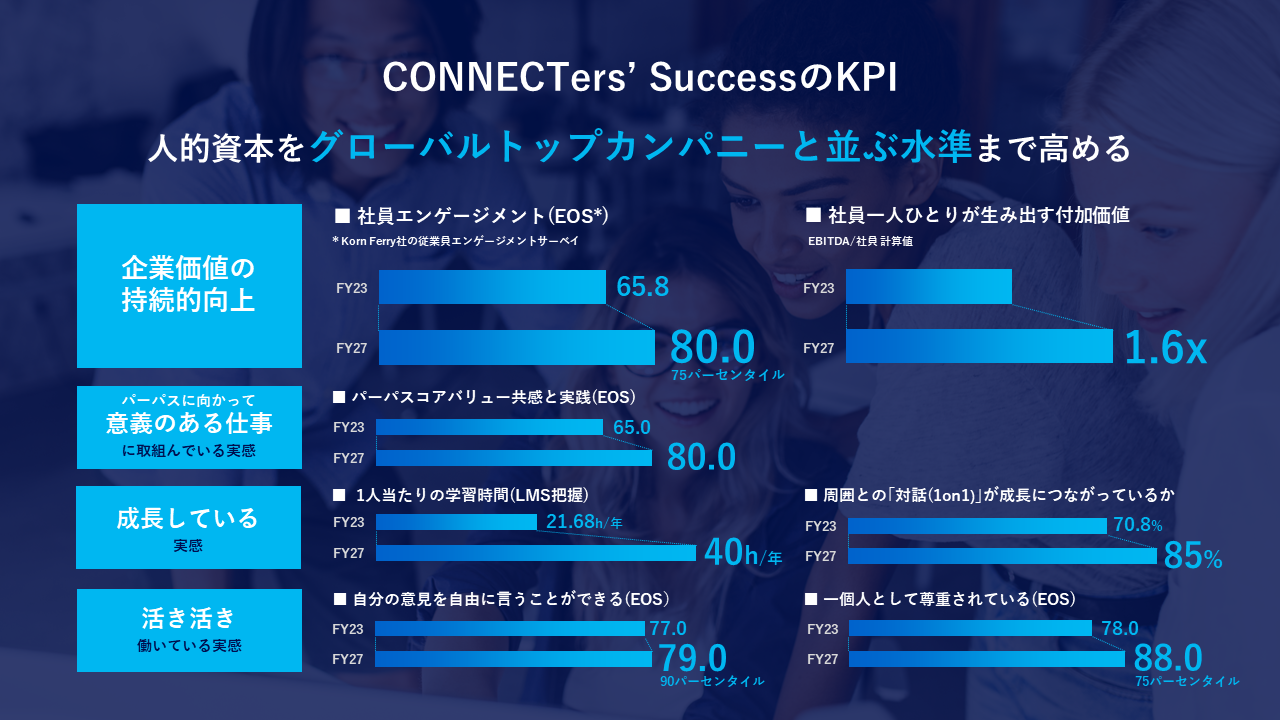 具体的には、持続的な企業価値の向上につながる「従業員エンゲージメント」のスコアを2023年度実績65.8ptから2027年度に80.0ptへ向上する、また、従業員がキャリアオーナーシップをもつ未来作りにつながるよう1人当たりの学習時間(年間)を2023年度実績21.68時間から2027年度に40時間(約1.8倍)にするといった数値目標を置いています。これらの指標は「人的資本をグローバルトップカンパニーと並ぶ水準まで高める」ことを意味しています。