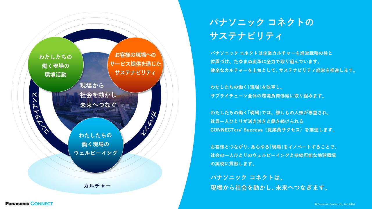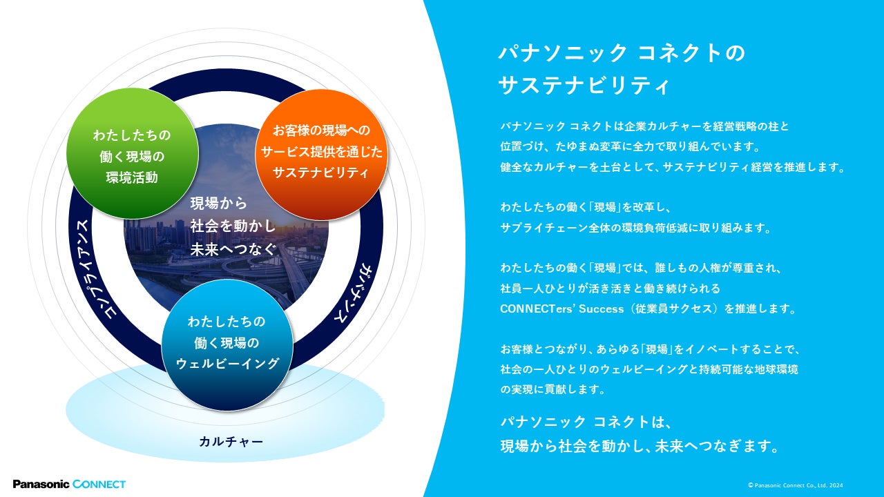 パナソニック コネクトは、「現場から 社会を動かし 未来へつなぐ」をパーパスにかかげ、現場にイノベーションをもたらすことで多様な人々が幸せに暮らせる、持続可能な社会の実現を目指してまいります。