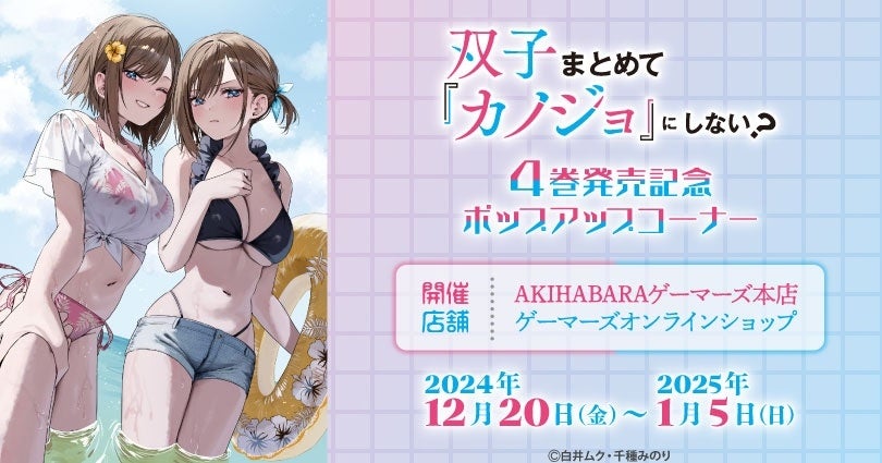 株式会社カードラボ ゲーマーズ(本社:東京都豊島区、https://www.gamers.co.jp/ 以下ゲーマーズ)は、2024年12月20日(金)より「双子まとめて『カノジョ』にしない?」4巻発売記念ポップアップコーナーを開催することをお知らせいたします。