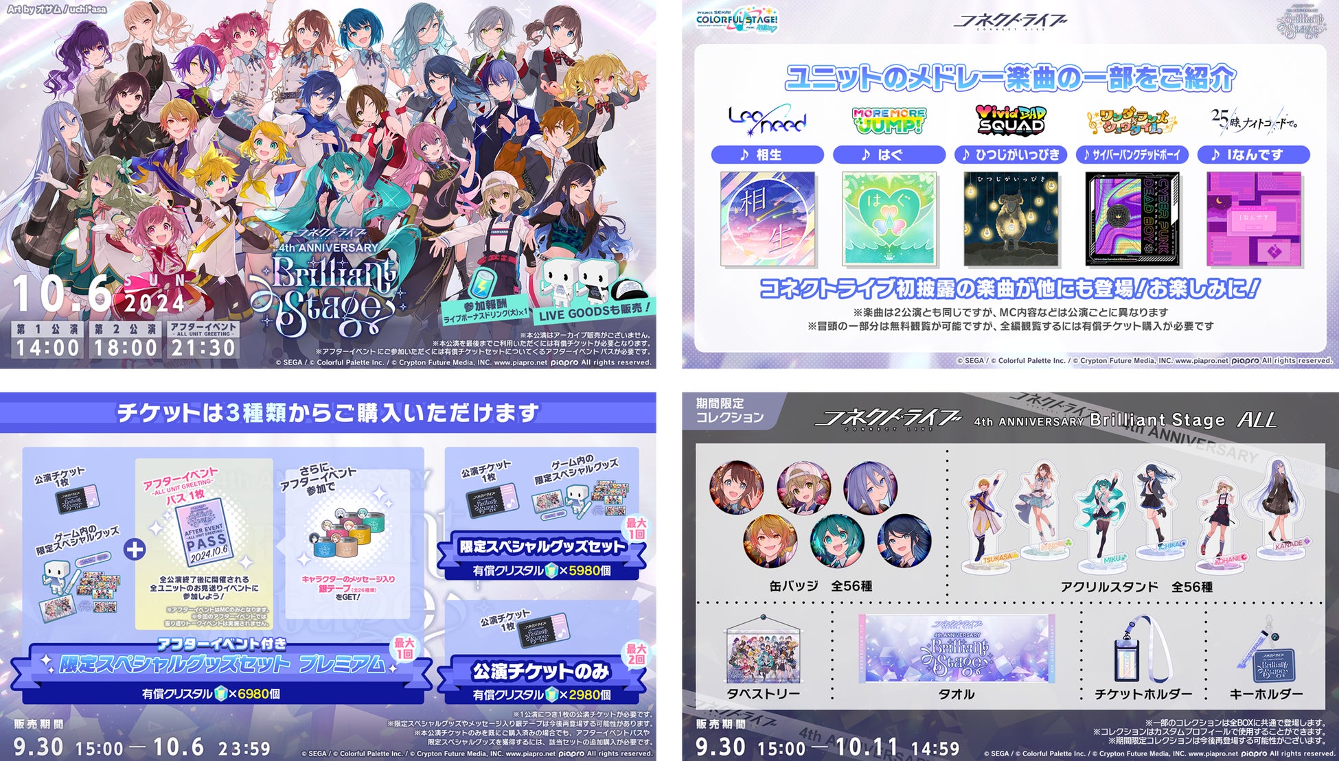 「コネクトライブ 4th ANNIVERSARY Brilliant Stage」を10月6日(日)に開催いたします。本公演は、全6ユニット全26人のキャラクターと、各セカイのバーチャル・シンガー全30人の計56人が出演し、公演時間は約2時間半、アフターイベントは30分を予定しております。なお、公演は10月6日(日)に2回の開催を予定しています。