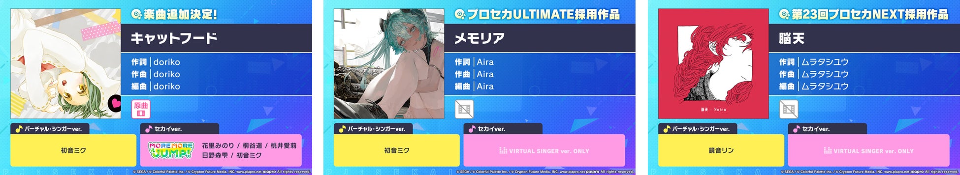 新たなリズムゲーム楽曲として、以下3曲の追加が決定いたしました。「メモリア」(作詞・作曲:Aira)は、「第2回プロセカULTIMATE」の採用作品、「脳天」(作詞・作曲:ムラタシユウ)は、「一緒に作ろう!第23回楽曲コンテストプロセカNEXT」の採用作品となります。
