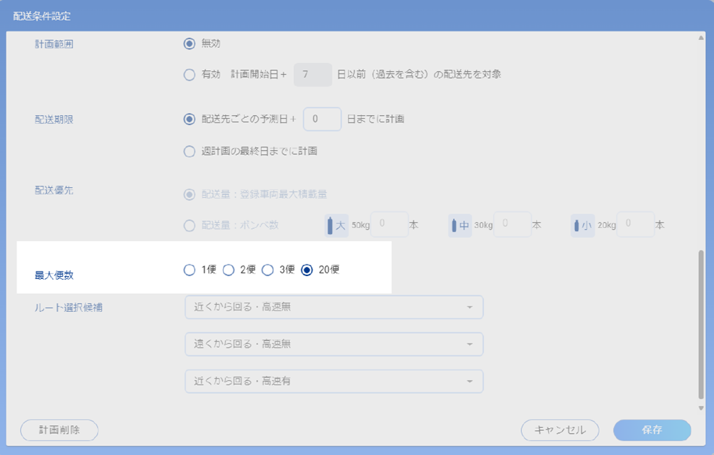 工場や給食センターなどでは、1日に大量のボンベ容器の交換が必要となり、配送先と充填所を何往復もする場合があります。1人1日に配送できる便数が、これまでの3便から最大20便まで設定が可能になり、このような配送業務の計画作成に対応できるようになりました。