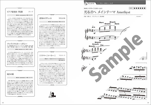 【楽譜】はNHK2024年大河ドラマ『光る君へ』のメインテーマ「Amethyst」をはじめ、NHKテレビ『YOASOBI 18祭(フェス)』のテーマソング「HEART BEAT/YOASOBI」、映画『サイレントラブ』主題歌の「ナハトムジーク/Mrs. GREEN APPLE」のほか、洗練されたカッコ良さで高い評価を受けているシティ・ポップからは「真夜中のドア/松原みき」、上質なジャズにアレンジした「眠りの精」など、弾きたい曲が必ず見つかる名曲が収録されています。ポップスからレパートリーにしたい定番曲、ジャズ、クラシックまで幅広いジャンルに対応しているので、この一冊があれば発表会や誕生会の各シーンでご活用いただけます。