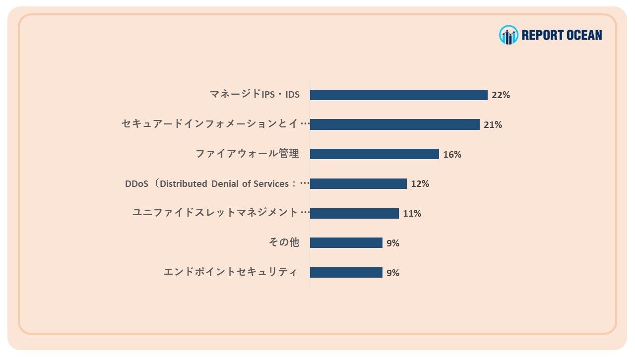 アプリケーションセグメントには、マネージドIPS&IDS、分散型サービス拒否(DDoS)、統合脅威管理(UTM)、セキュリティ情報およびイベント管理(SIEM)、ファイアウォール管理、エンドポイントセキュリティ、その他が含まれています。マネージドIPSおよびIDSのサブセグメントが2022年に最大のシェアを占めています。