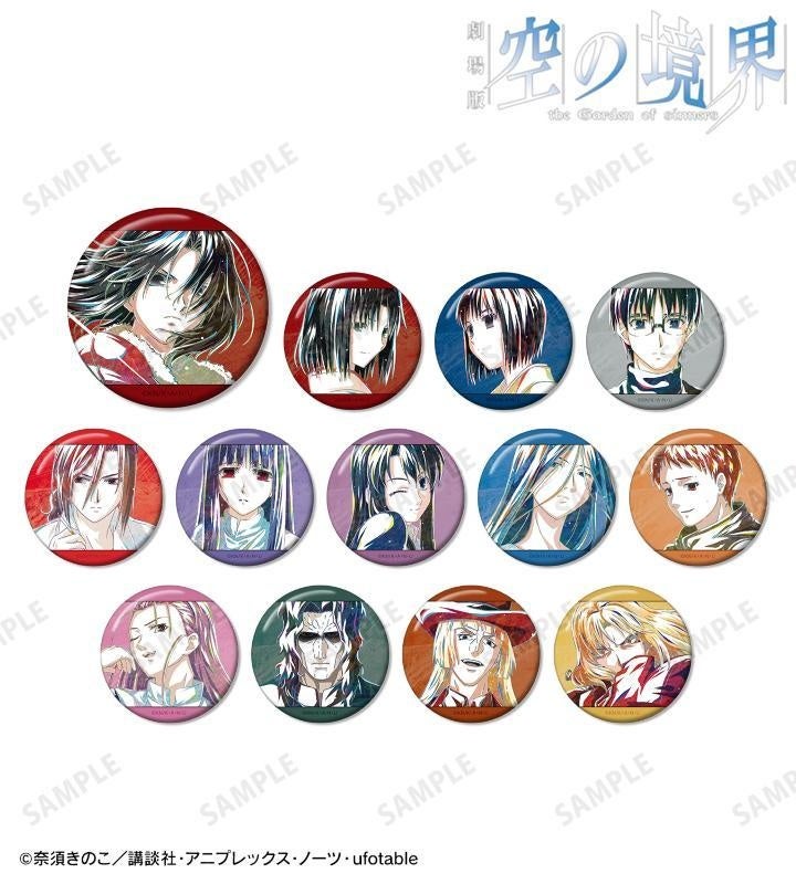 両儀式、両儀織、黒桐幹也、蒼崎橙子、浅上藤乃、黒桐鮮花、巫条霧絵、臙条巴、黄路美沙夜、荒耶宗蓮、コルネリウス・アルバ、白純里緒のイラストを新たなタッチで魅力的に表現し、缶バッジに仕上げました。