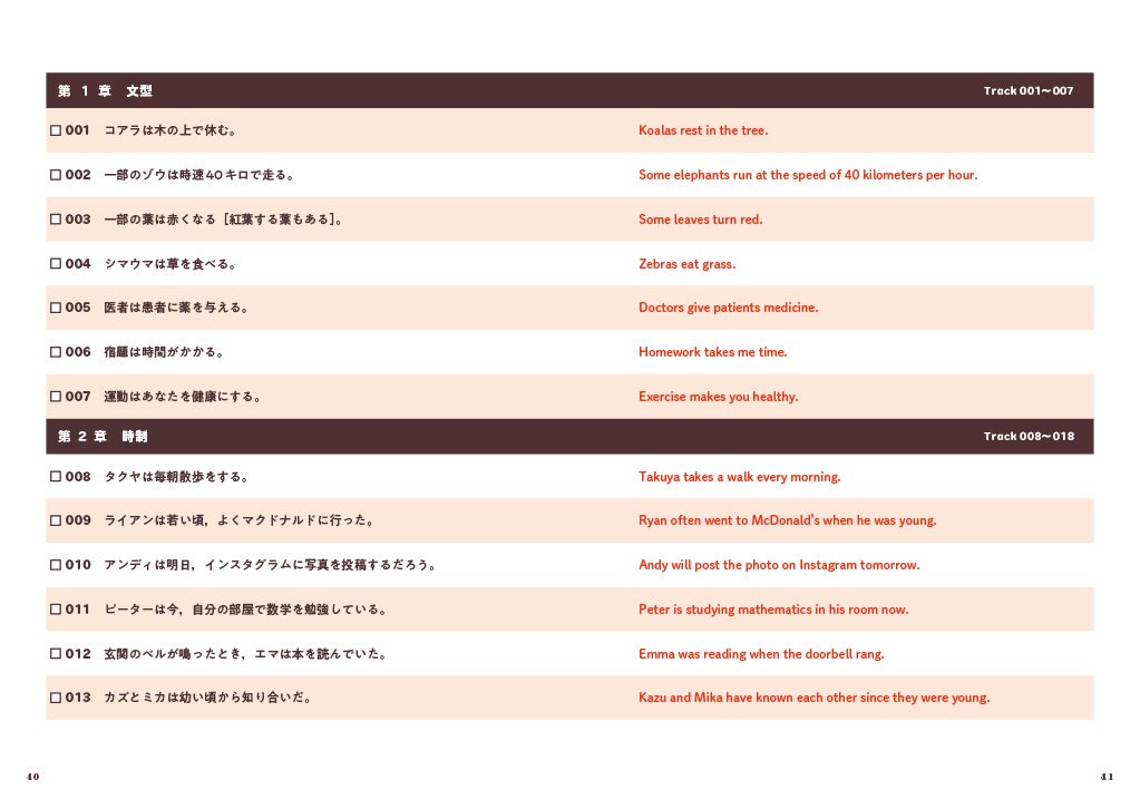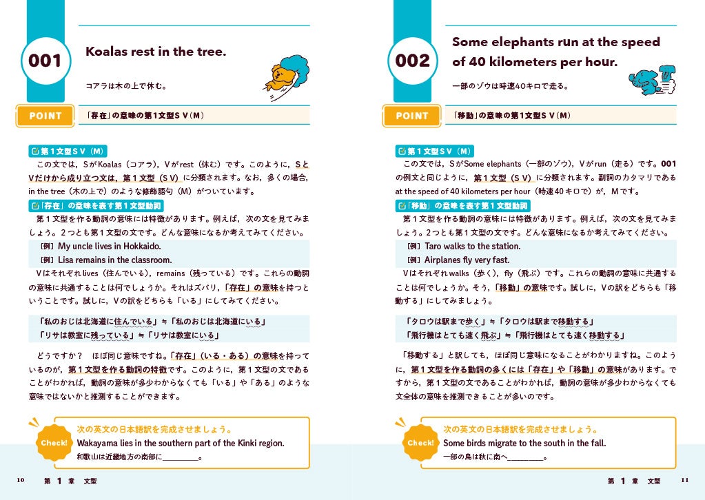 本冊各ページのいちばん上には、ぜひマスターしたい暗唱例文と日本語訳が掲載されています。すべての暗唱例文に重要な英文法のポイントが含まれていますから、英文法の解説を読み、最後にこのページの内容が理解できたかをCheck! で確認しましょう。