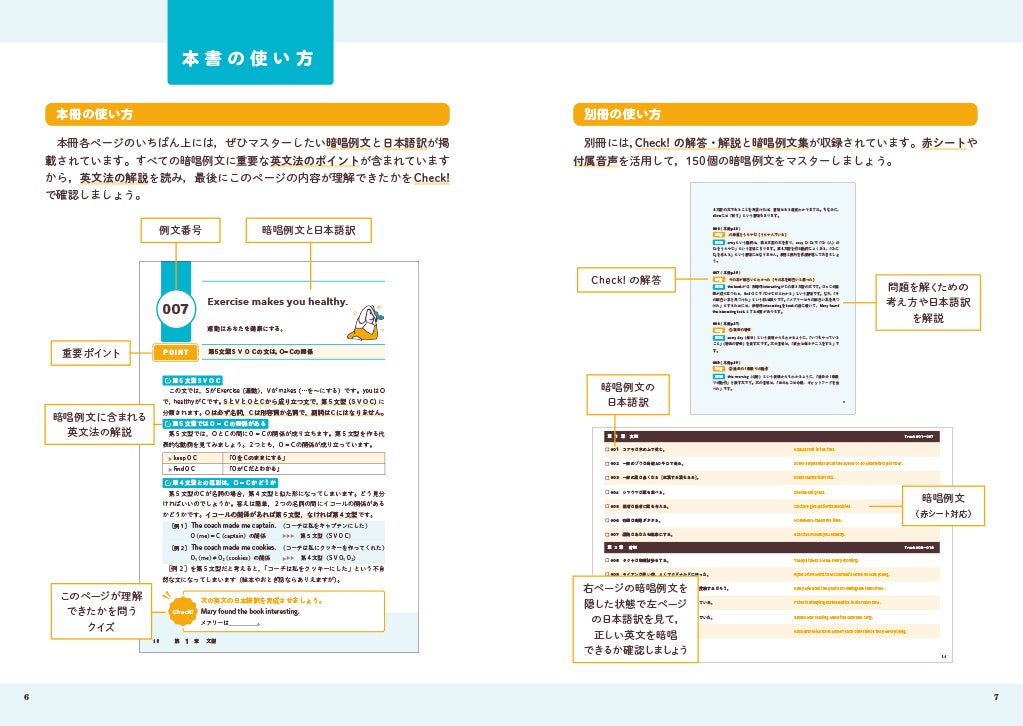 別冊には、Check! の解答・解説と暗唱例文集を収録。赤シートにも対応しています。また暗唱例文の音声はアプリとMP3ダウンロードの両方で利用することができます。別冊や無料音声を活用して、150個の暗唱例文をマスターしましょう。