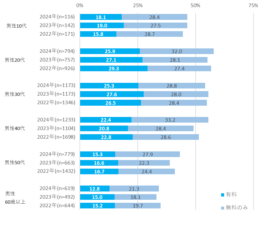 昨年調査時よりも有料での利用率が明らかに増加している年代は男性40代、女性20代30代です。